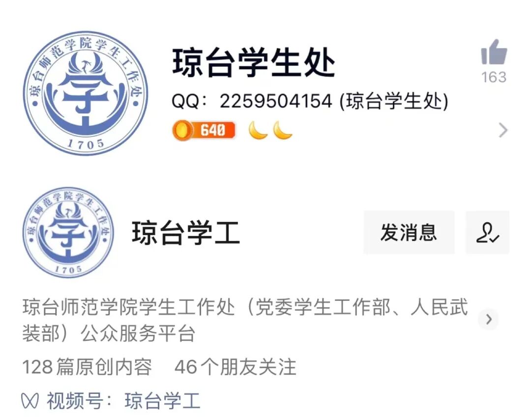 1、关注“琼台学工”微信公众号及琼台学工QQ(2239504154)。